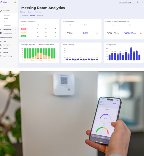 Arcade, an ELSYS customer, uses ERS CO2 sensors with the Alfons.io dashboard to visualize indoor air quality. The solution provides precise insights into CO2 levels, temperature, and humidity, helping improve air quality, space use, and employee well-being. Integrated with Philips Hue lighting, it signals high CO2 levels to encourage ventilation and maintain a safe, smart workplace.